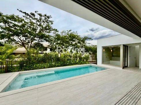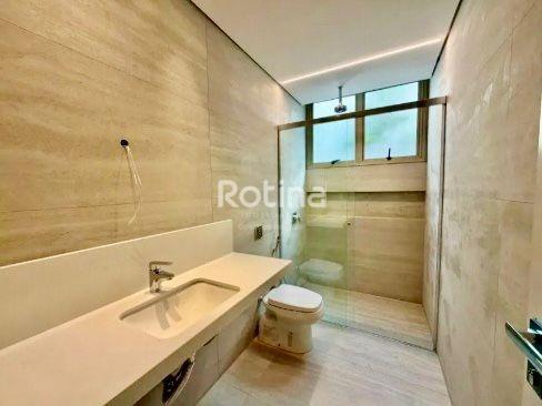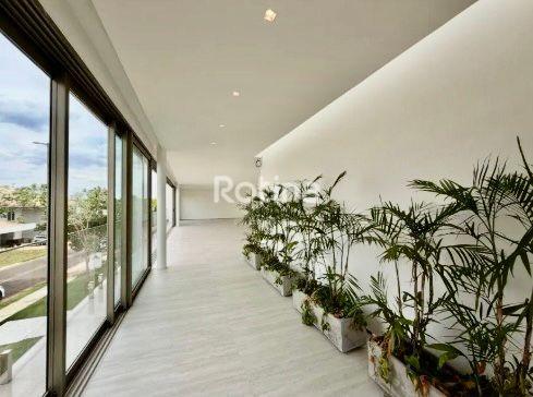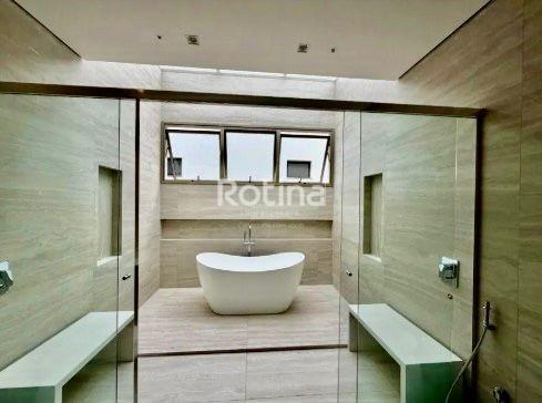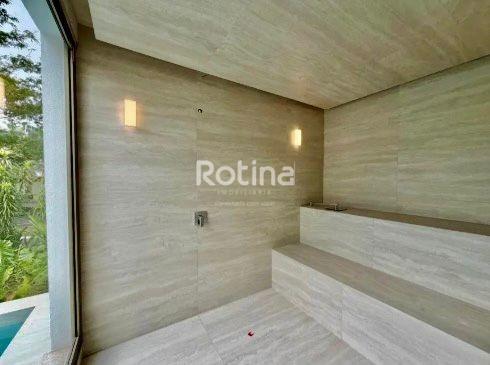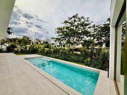 Residência de alto padrão localizada em área nobre de Uberlândia, em região valorizada, cercada pela natureza, com total privacidade, segurança e fácil acesso às principais vias da cidade. Implantada em terreno de 758 m², possui 650 m² de área construída, com ambientes amplos, sofisticados e bem distribuídos, projetados para conforto, lazer e funcionalidade. No andar térreo conta com 2 suítes, sendo 1 adaptável para academia ou estúdio, escritório reservado, copa, home cinema com isolamento acústico, adega, garagem para 6 carros sendo 3 cobertas, e 2 depósitos. No pavimento superior dispõe de 3 suítes, incluindo suíte master com banheiro amplo, banheira, closet iluminado e maleiro, além de sala de estar/TV com vista, cozinha moderna, lavanderia, louceiro, dispensa e banheiro de serviço. A área de lazer é completa, com espaço gourmet, 2 lavabos sociais, sauna integrada, piscina com spa, academia, campo de futebol, churrasqueira, playground, quintal, quadra poliesportiva e quadra de tênis. O imóvel ainda oferece elevador privativo, automação residencial e paisagismo com sistema de irrigação.