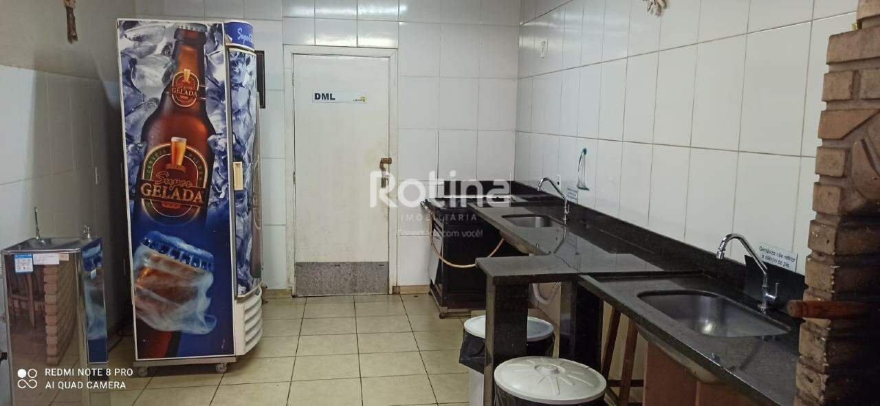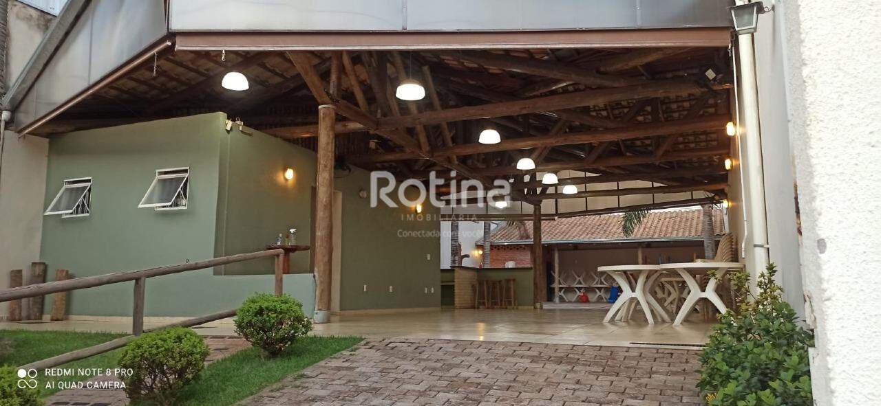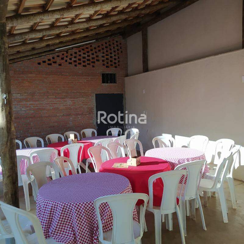 Salão de festas, próximo ao Rio Uberabinha e a 7min do centro da cidade. Espaço arejado, estilo rústico. Conta com banheiro feminino (fraldário) e masculino, 02 depósitos, cozinha arejada com pia em duas cubas e balcão em pedra Ubatuba preta, com churrasqueira de tijolinho a vista (grande), área aberta com jardim e coqueiros (adultos) e jardim na frente com coqueiro (adulto), portão social e de veículo sendo esse com motor. Fácil acesso, rua tranquila para estacionar. 01 fogão semi industrial com forno, 01 freezer cervejeiro, 01 refrigerador, 18 jogos de mesa com 05 cadeiras/cada, 03 tampões com cavalete, 02 ventiladores de parede.